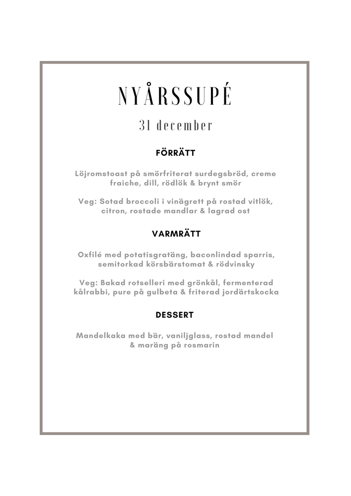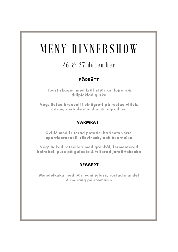 Menyerna för vår dinnershow i mellandagarna och nyårssupén finner ni nedan.
